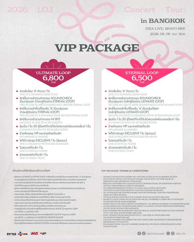 เตรียมตัวให้พร้อม! ถึงเวลาที่เหล่าโปรดิวเซอร์แห่งชาติจะกลับมาทำหน้าที่อีกครั้ง เพราะสาวๆ กำลังจะกลับมาให้คุณ “Pick Me Up” ในหัวใจ! กับช่วงเวลาล้ำค่าหลังรอคอยกว่า 9 ปี ที่เสียง “Yes, I Love It!” จะดังกึกก้องในหัวใจของแฟนชาวไทยอีกครั้ง โดยงานนี้จะเปิดจำหน่ายบัตรในวันเสาร์ที่ 2 พฤษภาคม 2569 สำหรับรอบ IME PRE-SALE เปิดขายตั้งแต่เวลา 10.00 – 15.00 น.เท่านั้น ผ่านทาง www.fantopia.io และสำหรับรอบทั่วไปจะเริ่มเปิดจำหน่ายตั้งแต่เวลา 18.00 น. เป็นต้นไป ผ่านทาง www.imethai.com ราคาบัตร ULTIMATE LOOP 6,800 (บัตรยืน)/ ETERNAL LOOP 6,500 (บัตรยืน) / 5,500 (บัตรยืน) / 4,900 / 3,900 / 2,900 บาท ทุกที่นั่งทุกราคาบัตรรับโฟโต้การ์ด 1ใบ (สุ่มแบบ), โปสเตอร์ และบัตรแข็งที่ระลึก
